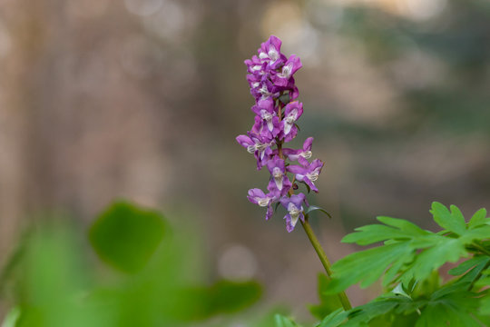 Spring purple flowering plant Corydalis cava in a deciduous forest