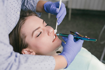 Young woman at dentist office checking and selecting colour of the teeth
