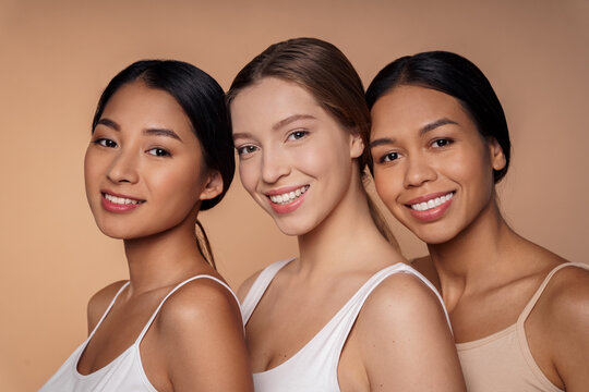 Portrait of there multi-ethnic beautiful young women hugging, smiling to camera