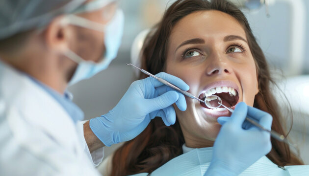 Woman having teeth inspected by dentist during checkup to ensure good oral health