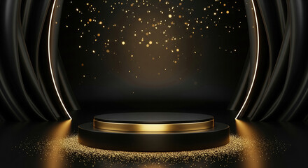 Black friday banner background with a podium platform; black and gold stuff on a dark scene for product stand