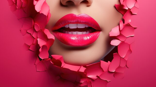 Beautiful plump bright lips in the style of red and pink, conceptual pop, cut/ripped into the slit of colored paper.
