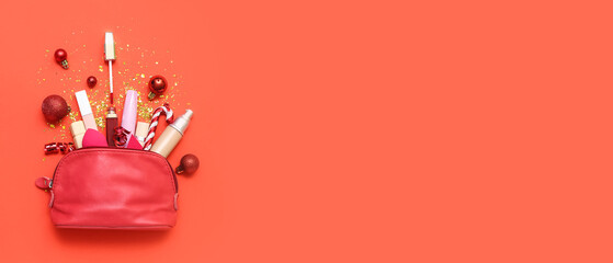 Various mock-up cosmetic bottles and jars displayed with a red Santa Hat on a green background, conveying a Christmas sale for beauty products with ample copy space image.