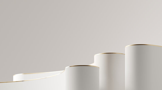 Minimal abstract background for product presentation. White podium with golden rim on white podium. 3d render illustration. Clipping path of each element included.