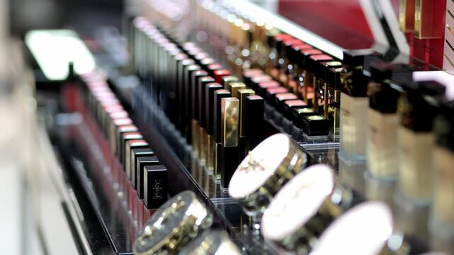 Various  cosmetic products of a modern cosmetics store close-up. Concept of cosmetic products, discounts and shopping.