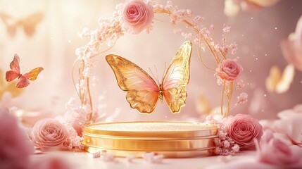 A luxurious golden butterfly podium with pink rose flowers and a D floral arch, set for a beauty product showcase. Soft pastel background.