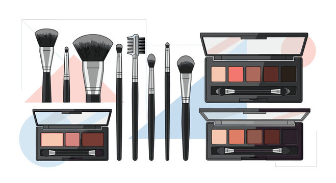 Eyeshadow palettes and cosmetic brushes arranged attractively with blank space for text in an upscale beauty shopping environment
