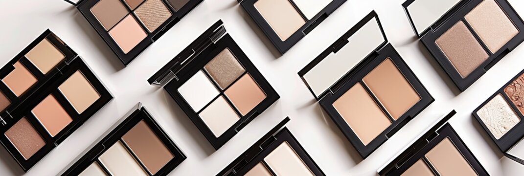 A collection of makeup palettes and highlighters arranged on a white background. Generative AI