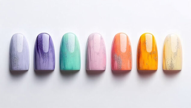 Set of nail tips with sparkling rainbow pastel color gradient for manicure art.