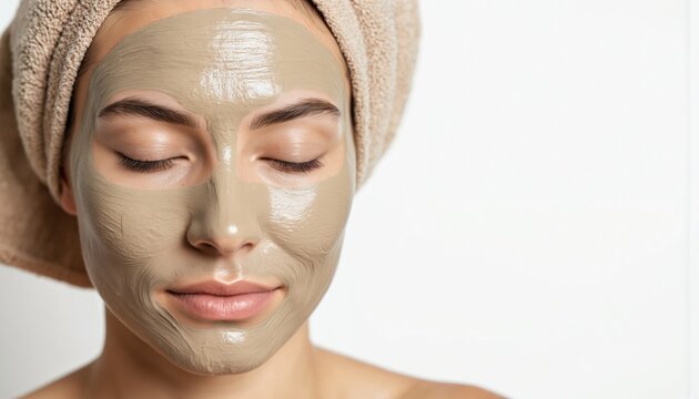 Woman enjoys natural clay face mask for skincare. Relaxing spa treatment promotes rejuvenation and detox. Enjoy pampering with cosmetic benefits for smooth skin.