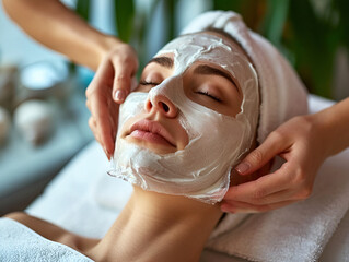 Spa salon treatments. Beautician applying cosmetic cream on woman face, lady receiving facial treatment and relaxing with closed eyes