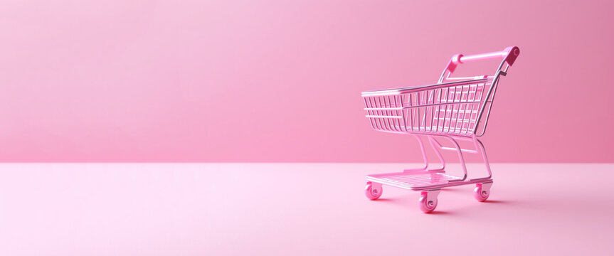 Generative AI, pink shopping cart on pink background, minimalistic shop online, free delivery, discounts and sale concept.