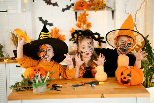Halloween, kids boys and a girl in festive costumes and makeup are preparing for Halloween at home in the kitchen by coloring and carving pumpkins and scaring everyone