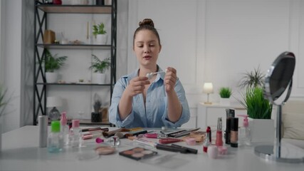 Young female cosmetics influencer doing a live online tutorial, testing and applying makeup and beauty products at home. Happy African American social blogger creating content to gain followers