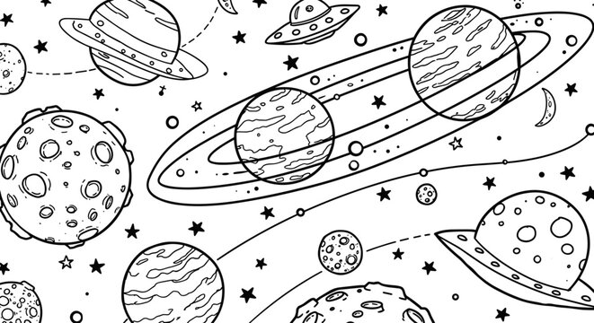 Space adventure vector illustration, black and white, hand drawn style, design for print, poster, or coloring book