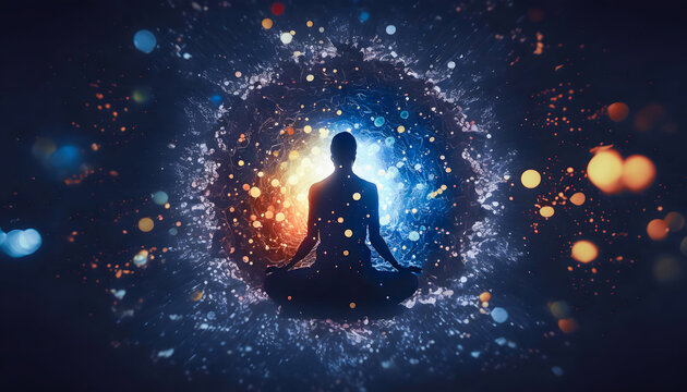The concept of esoteric spiritual meditation, a woman in the lotus position. Human meditation, spirituality and chakra activation, mystical spirit.