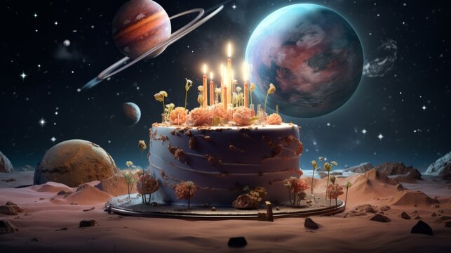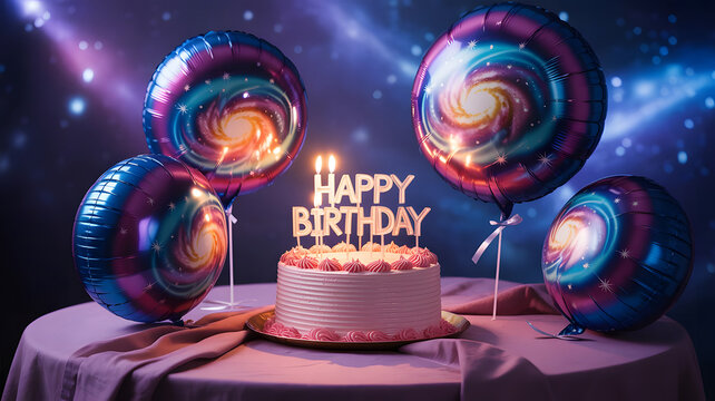 Celestial Party 3D Happy Birthday with a starry cake, moon balloons, and cosmic confetti