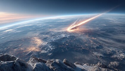 Earth apocalypse with asteroid impact and fiery explosion burning planet surface in cosmic destruction