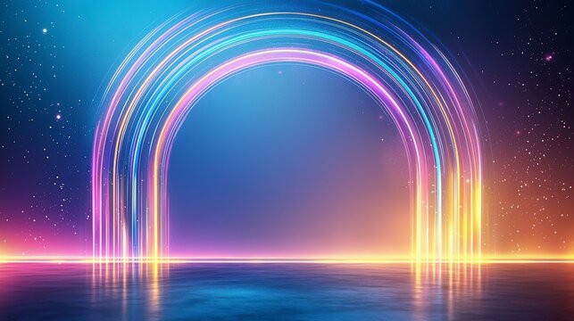 Vibrant neon rainbow arch over a shimmering water surface, set against a cosmic backdrop filled with stars and glowing colors.