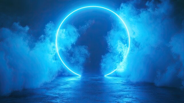 A neon circle in blue smoke. Perfect for abstract, technology, or futuristic designs.