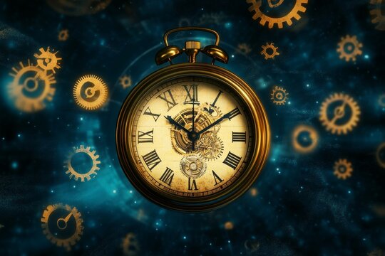Steampunk Vintage Clock with Gears and Roman Numerals Against a Cosmic Background