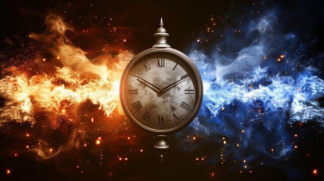 A vintage clock is centrally positioned against a cosmic backdrop of fiery orange and cool blue, symbolizing the duality of time and elements.
