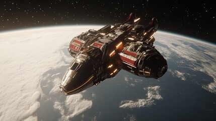 Cosmic voyage - close-up of futuristic space scene with nebulae, stars, and spaceship, copy space on right. Space Opera Scene. Illustration