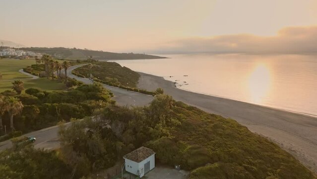 Drone perspective of costal city of Torrox situated in Malaga, Costa del Sol, Spain. Touristic travel destination. View of the promenade and beach area. The lighthouse of Torrox and the river.