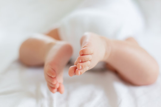 Baby's feet. Bare heels of little child wearing white bodysuit and diaper. Cozy morning bedtime at home.