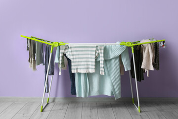 A stack of neatly folded dark clothes isolated on a black gray background close-up