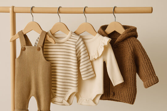Colorful assorted clothes on wooden hangers in fashion retail store