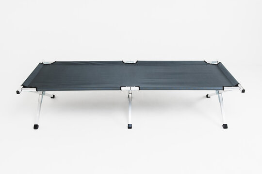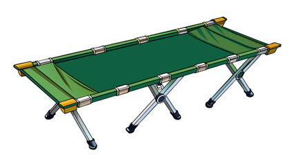 A heavyduty militarystyle camping cot made of reinforced steel and fitted with a green canvas cover. The cot has adjustable legs to accommodate uneven. Cartoon Vector.