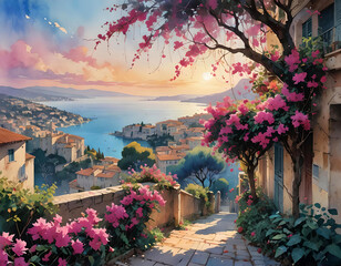 Watercolor illustration of the Cote d' Azur at dawn