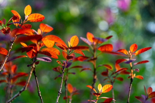 Vibrant red leaves on Cotinus coggygria Royal Purple (Rhus cotinus, the European smoketree), illuminated by sunlight, creating striking contrast against the soft, blurred green background