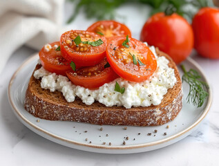 Sandwich with cottage cheese, tomatoes and basil on white wooden background. Traditional Italian bruschetta. Healthy savory feta and tomato toast. Top view.