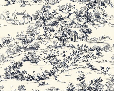 Elegant Blue and White Toile Landscape Pattern Houses Trees Flowers Seamless Repeat