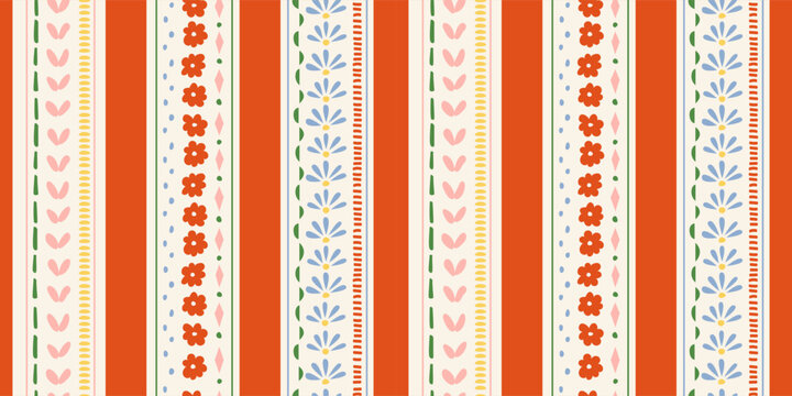 Seamless pattern with ink doodle abstract flowers and strokes in vertical stripes. Trendy cottage core background. Hand drawn vector illustration. Boho, beach, preppy wallpaper.