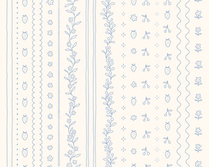 Hand drawn cottage core seamless border set with a charming delicate design. Soft blue pastel florals, fruits and lines, perfect for romantic vintage-inspired decor.