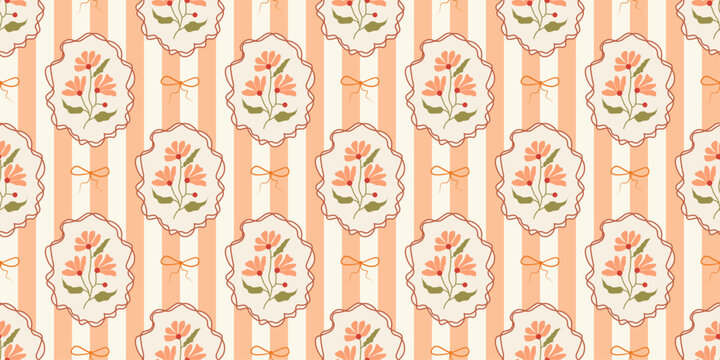 Seamless pattern on a striped background with hand drawn flowers in vintage frames and bow. Cottagecore coquette trendy print in fall colors. Vector illustration for textile, wrapping paper.
