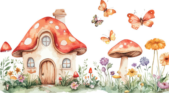 Enchanting watercolor illustration of a whimsical mushroom house nestled in a magical forest clearing with butterflies