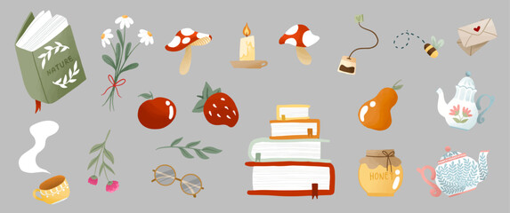 Set of watercolor cottagecore goblincore, isolated on transparent background