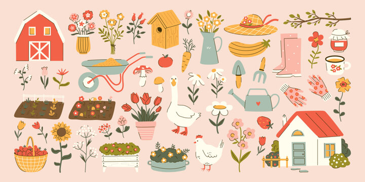 Cute cottagecore illustrations. Hand drawn flowers, bows, barn, goose, chicken,butterfly, garden tools, birdhouse. Gardening and country lifestyle. Spring summer stickers. Vector flat illustration.