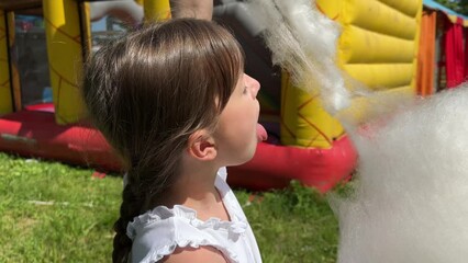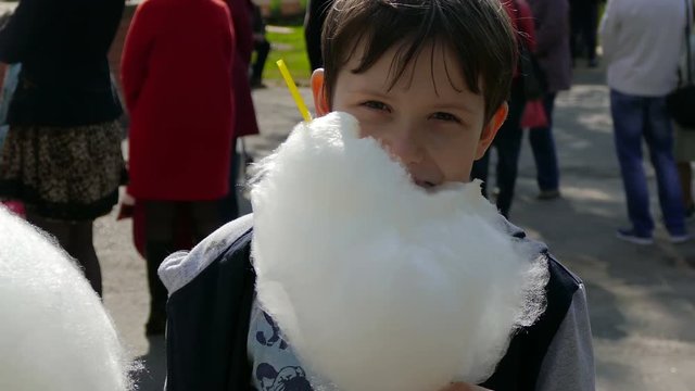 a happy child eats sweet cotton candy at an amusement park on a summer day, a child eats cotton candy and licks his fingers.