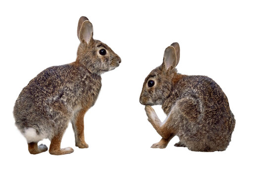 Two rabbits, possibly eastern cottontails (Sylvilagus floridanus) but please check with an expert. Transparent PNG cropped photo assets . Original photos by me on Lido Key, Florida.