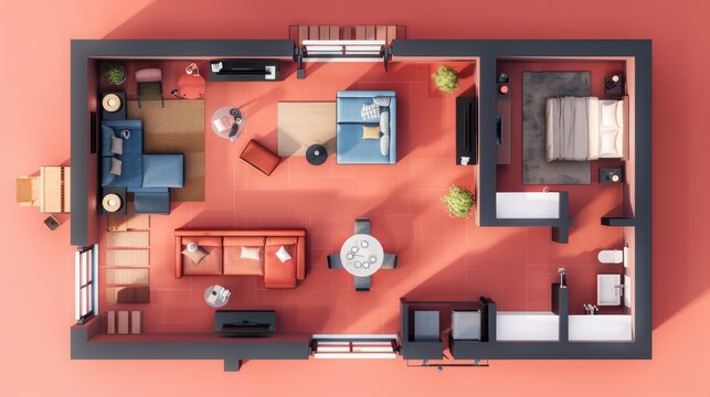 Aerial perspective of a cozy brown leather couch adorned with cushions for comfort