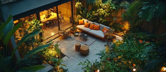 Luxury rooftop lounge with sleek seating, warm lights, and a mesmerizing aerial view of the bustling cityscape at dusk