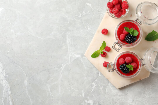 Delicious panna cotta with fruit coulis and fresh berries on light grey table, top view. Space for text