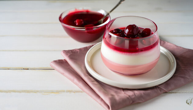Italian panna cotta dessert with cherry coulis on a white wooden table