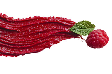 Vibrant raspberry coulis brush stroke with fresh mint leaf on a white background for culinary presentation and creativity