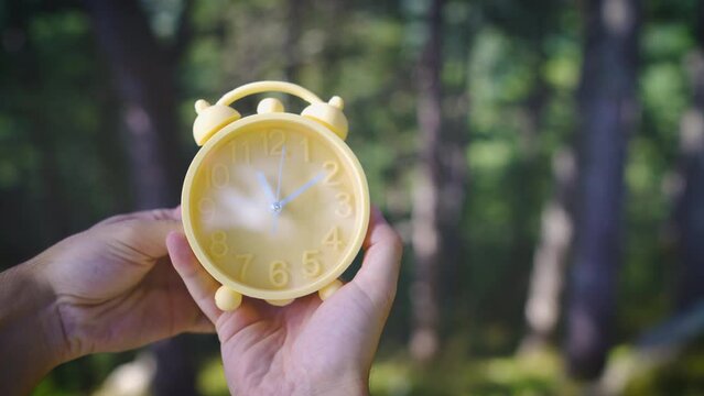 Winter time changeover, end of daylight saving time in autumn, alarm clock fall back switch, forest with colorful foliage